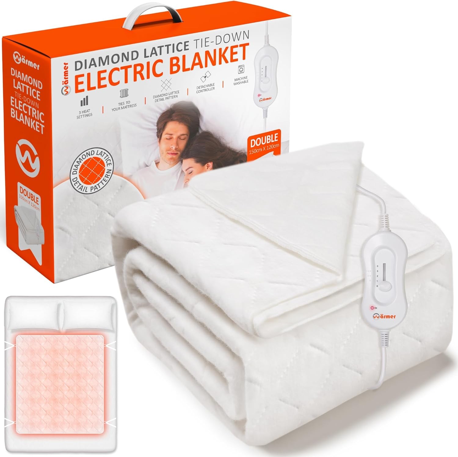 Wärmer Double Electric Heated Blanket XL 150cm x 120cm- Control with 3 Heat Settings, Detachable Controller, Machine Washable Diamond Lattice Tie Down