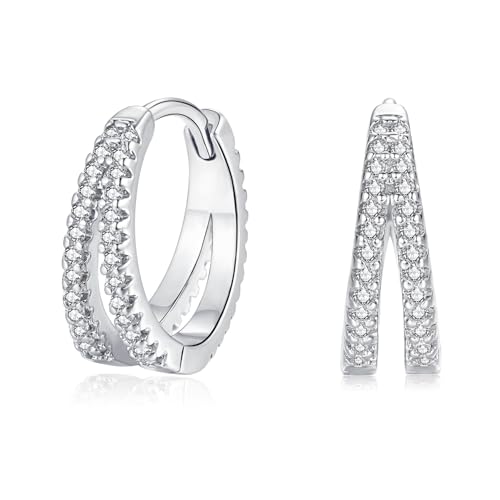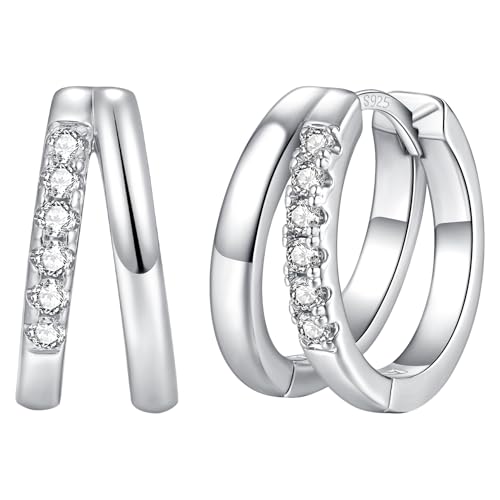 Cangall 925 Sterling Silver Double Layer Hoop Earrings with Cubic Zircon - Hypoallergenic Minimalist CZ Small Cartilage Sleeper Huggie Design