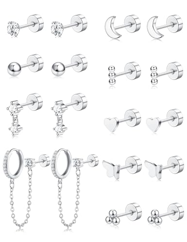 FANCH 9Pairs Flat Back Stud Earrings for Women Hypoallergenic Surgical Steel Silver Double Piercing Stud Hoop Earrings Chain Drop CZ Cartilage Helix Earrings Sets for Multiple Piercings