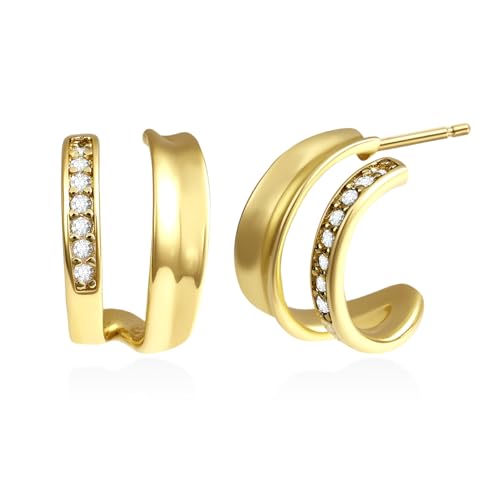Weviway Double Huggie Hoop Earrings for Women, 14K Gold Plated Hypoallergenic Statement Earrings, Elegant Drop Dangle Hoops with Zirconia