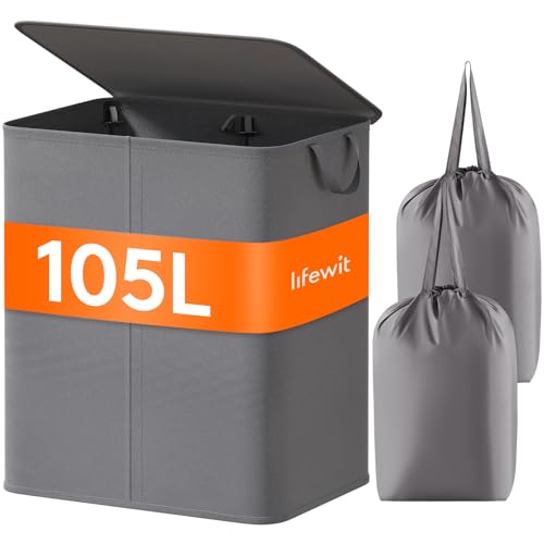 Lifewit 105L Laundry Basket with Lid, Large Double Laundry Hamper 2 Section Dirty Clothes Hamper with 2 Removable Laundry Bags and Handles for Clothes Toys for Dorm Bedroom Laundry Sorting, Grey