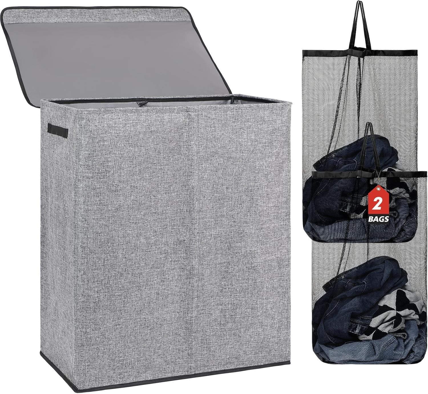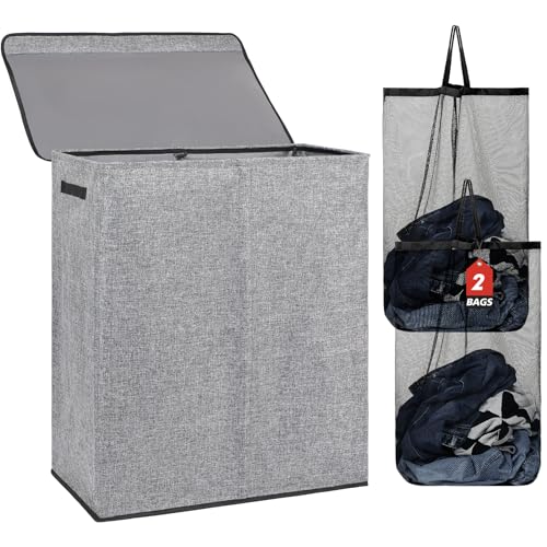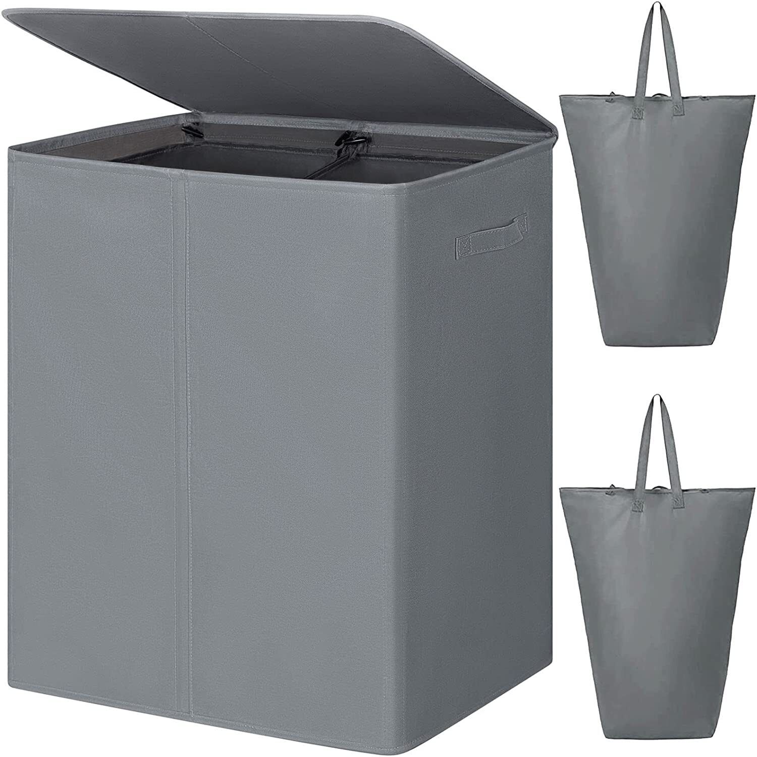 Lifewit 105L Double Laundry Hamper with Lid and Removable Laundry Bags, Large Divided Hamper, Collapsible 2 Section Laundry Basket with Handles for Bedroom, Bathroom, College Dorm, Laundry Room, Grey
