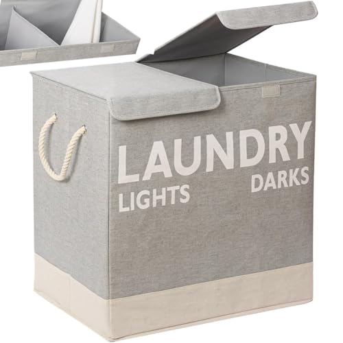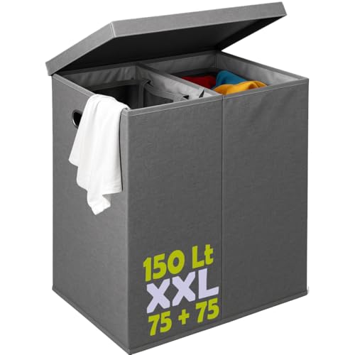 DOKEHOM 150L Double Laundry Basket with Lid and Removable Laundry Bags, Large Collapsible Laundry Hamper with 2 Sections for Bedroom, Bathroom, Laundry Room, Colloge (Grey)