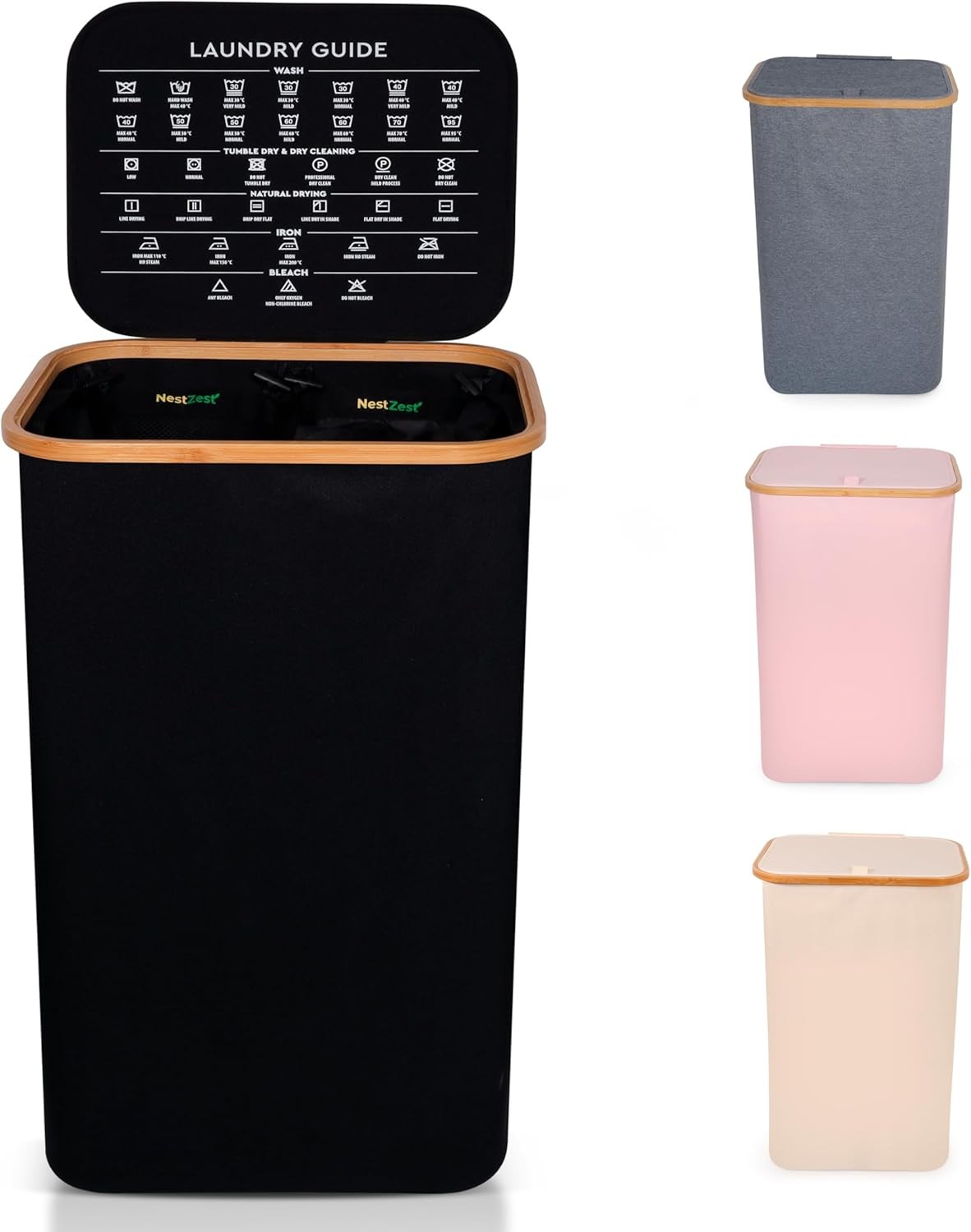 Nest Zest 100L Double Laundry Basket with Lid, 2 Compartments to Sort Washing, Hamper Laundry Bin with Care Guide & 2 Removable Inner Bags, Dirty Clothes Basket with Bamboo Rim Oxford Fabric (Black)