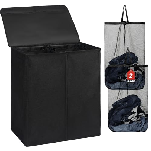 Lifewit 105L Double Laundry Hamper with Lid and Removable Laundry Bags, Divided Laundry Basket with Handles, Large Separated Clothes Basket for Bedroom, Bathroom, College Dorm, Laundry Sorting, Black