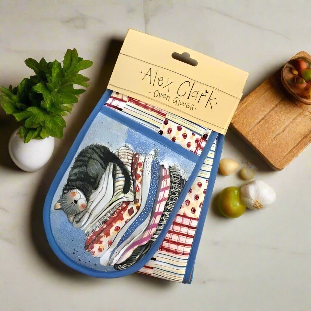 Alex Clark Laundry Basket Cat Double Oven Gloves Mitts Blue Cream Pot Holder