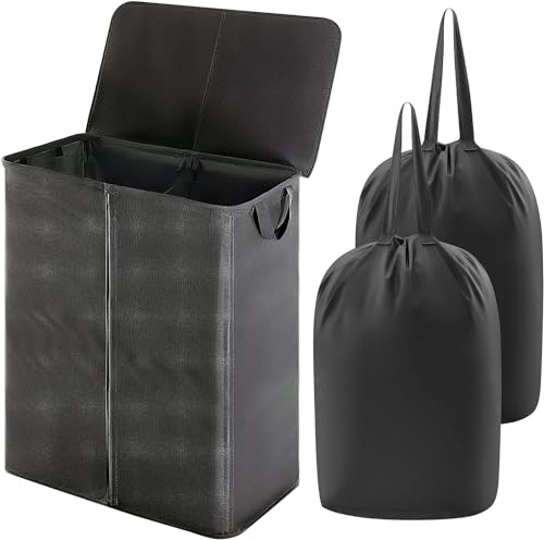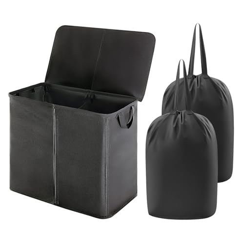 Chrislley 154L Double Laundry Basket with lid and Removable Laundry Bags Large Collapsible 2 Dividers washing basket with Handles for Bedroom Laundry Room Closet Bathroom College (Black)