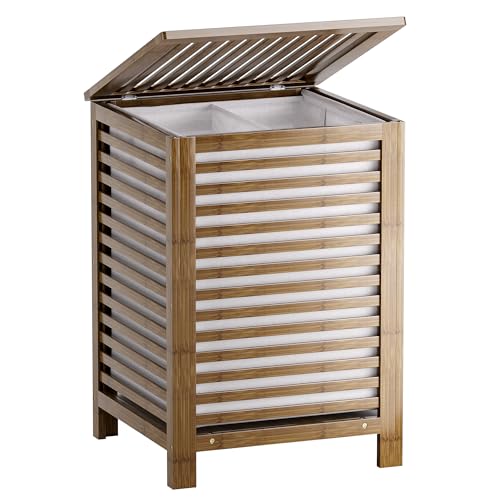 BAKAJI Dirty Laundry Basket with Double Compartments, 2 Spaces of Bamboo and Fabric, 100 Litres – 52 x 32 x 63 cm
