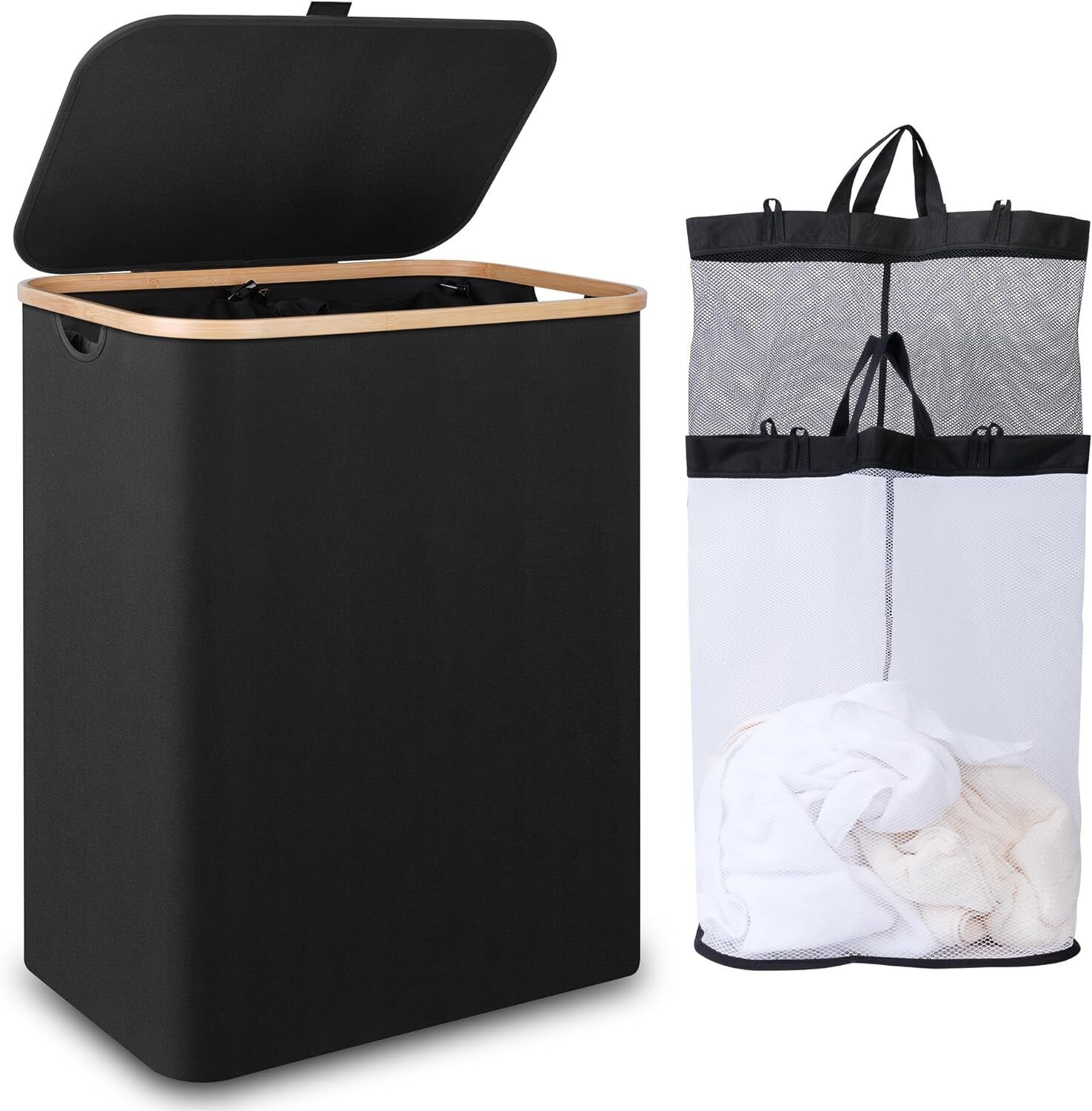 Lifewit 160L Double Laundry Hamper with Lid, Extra Large Bamboo Laundry Basket Dirty Clothes Hamper, 2 Section Laundry Bin Organizer for Laundry Room Bedroom with 2 Removable Liners & Bags, Black