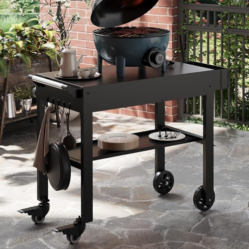 PIZZELLO Outdoor Grill Cart Movable Pizza Oven Table Stand Double-Shelf Trolley Dining Cart Foldable Tabletop Food Prep Worktable with 2 Wheels, 4 Hooks