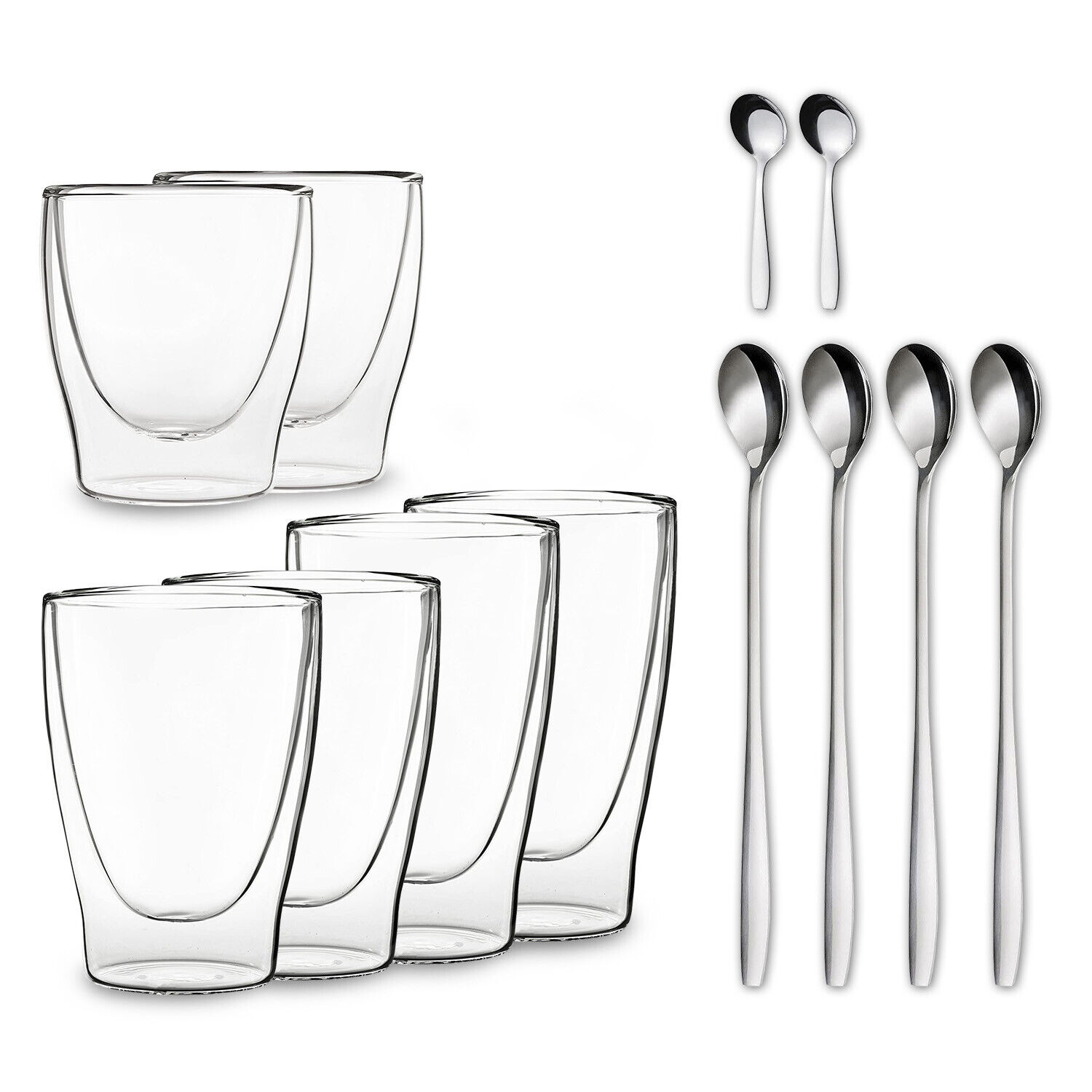 2x Double Walled Coffee Glasses with 12 Spoons 285ml Clear
