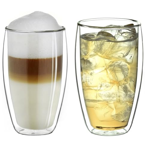 ecooe Double Walled Latte Macchiato Glasses Cups Borosilicate Glass Cups Set of 2 450ml Coffee Glass Tea Glasses with Handle for Cappuccino, Latte Macchiato, Tea, Ice Cream, Milk, Beer