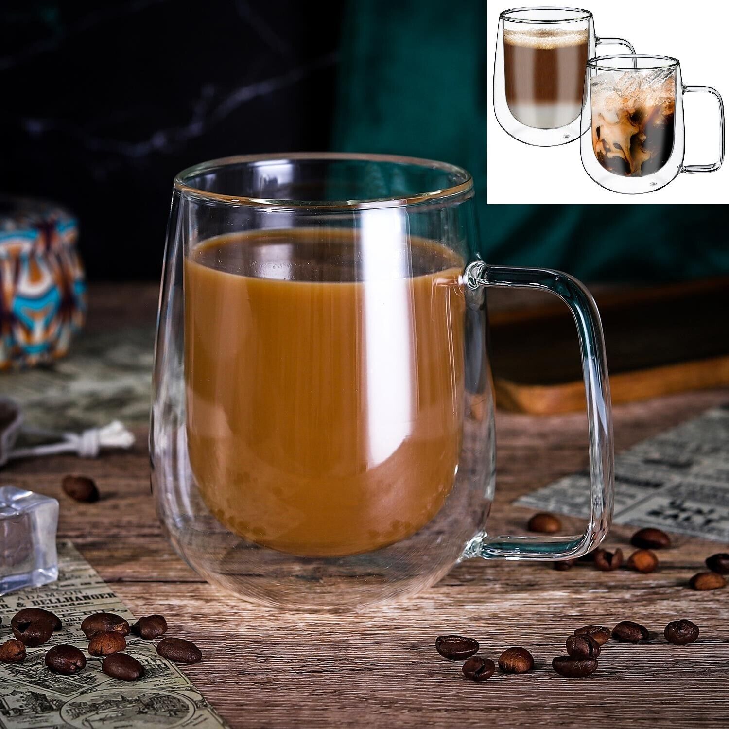 ecooe 2x240ml Double Walled Coffee Glasses Mugs Cappuccino Latte Macchiato Glasses Cups with Handle Borosilicate Heat Resistant Glass Cups for Coffee Tea Milk Juice Ice Cream