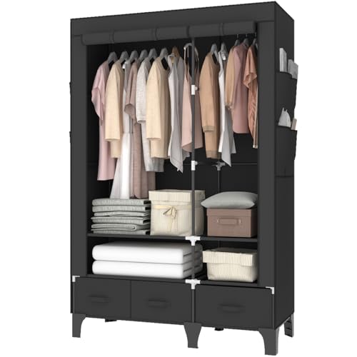 OPPAIYA Canvas Wardrobes, Double wardrobe With 2 Hanging Rails, 7 Shelves、8 Side Bags & 3 drawer, 165 * 45 * 109cm Temporary wardrobes, Fabric wardrobes for bedroom, wardrobe with drawers - Black