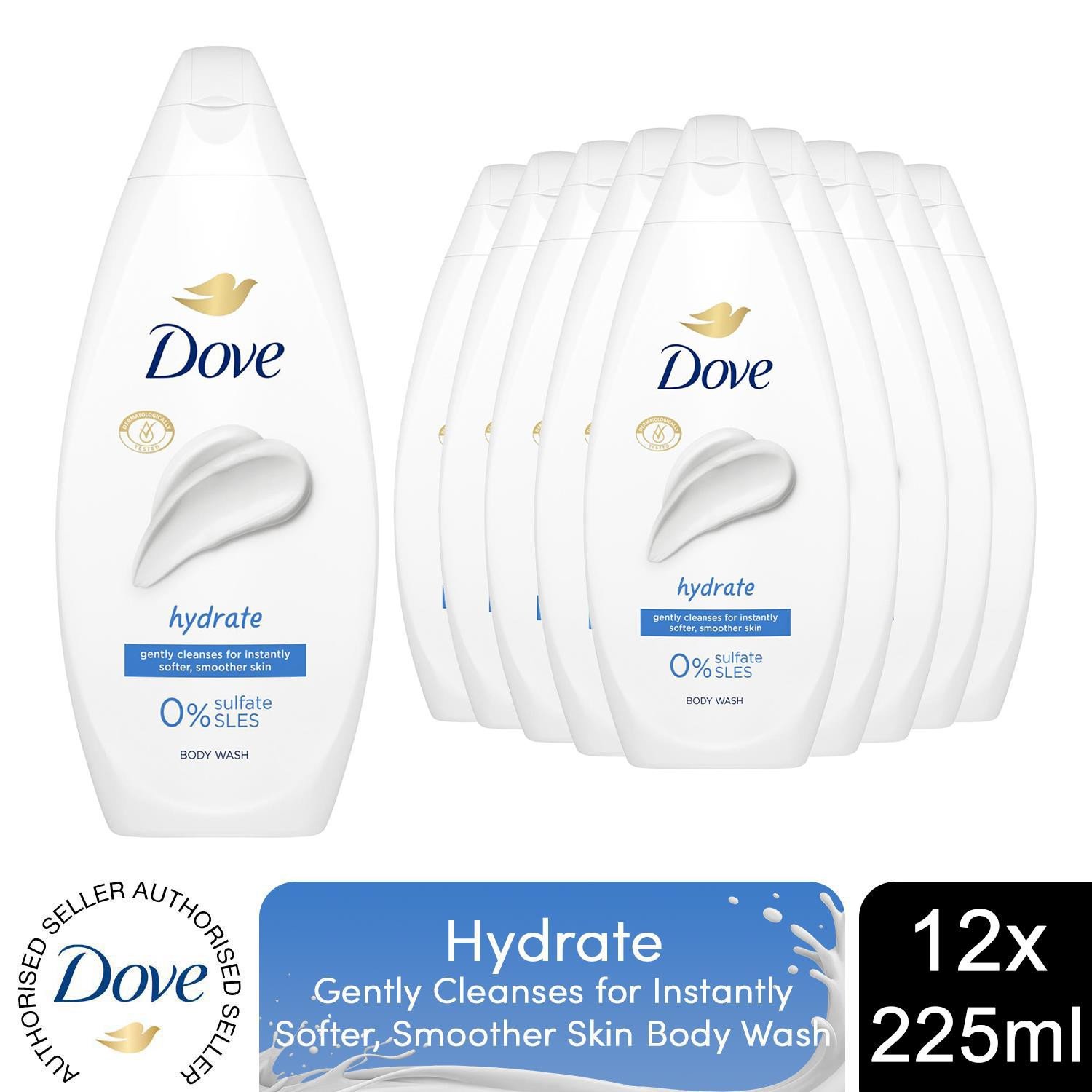 Dove Hydrate Body Wash 0% Sulfate SLES for Softer & Smoother Skin 225ml, 12 Pack