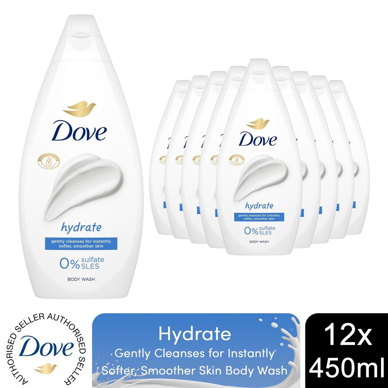 Dove Hydrate Body Wash 0% Sulfate SLES for Softer & Smoother Skin 450ml, 12 Pack
