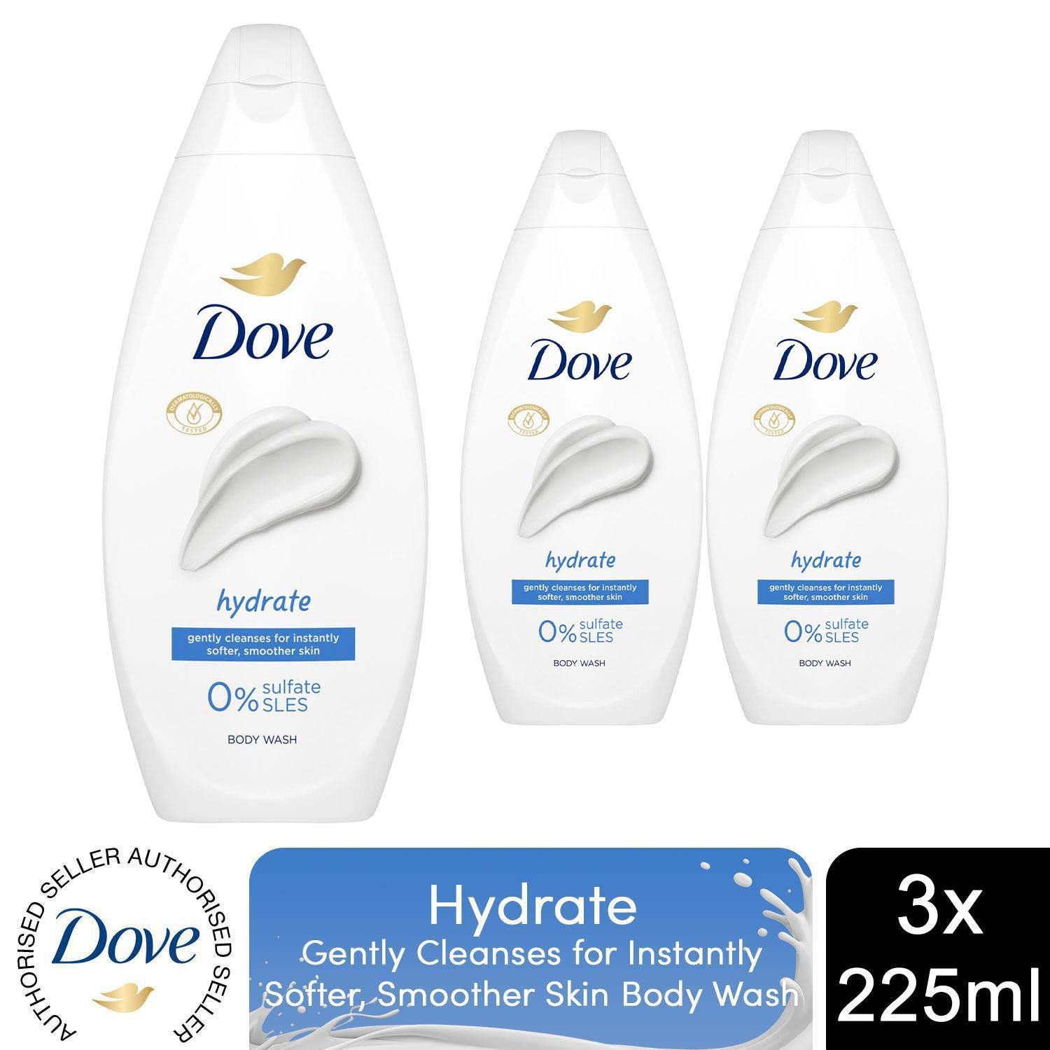 Dove Hydrate Body Wash 0% Sulfate SLES for Softer & Smoother Skin 225ml, 3 Pack
