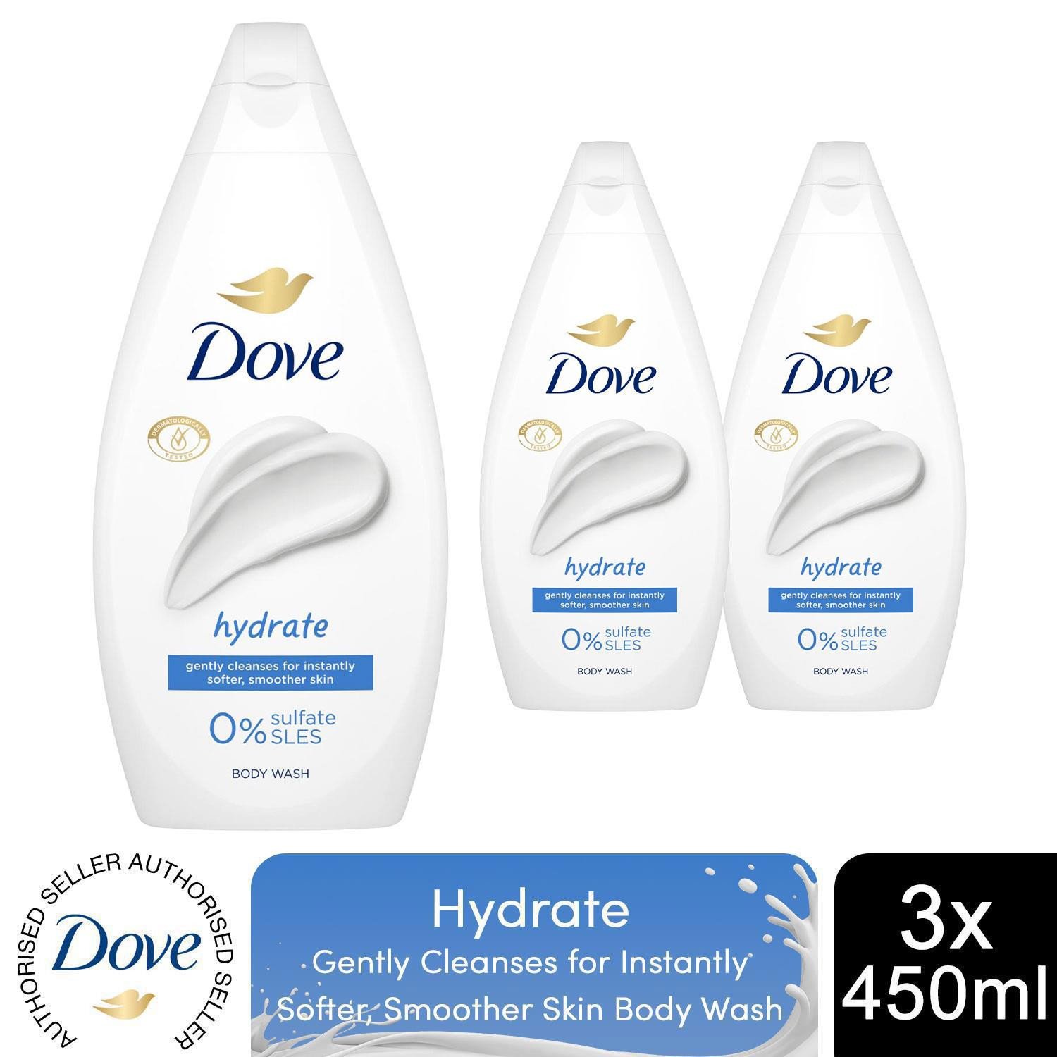 Dove Hydrate Body Wash 0% Sulfate SLES for Softer & Smoother Skin 450ml, 3 Pack