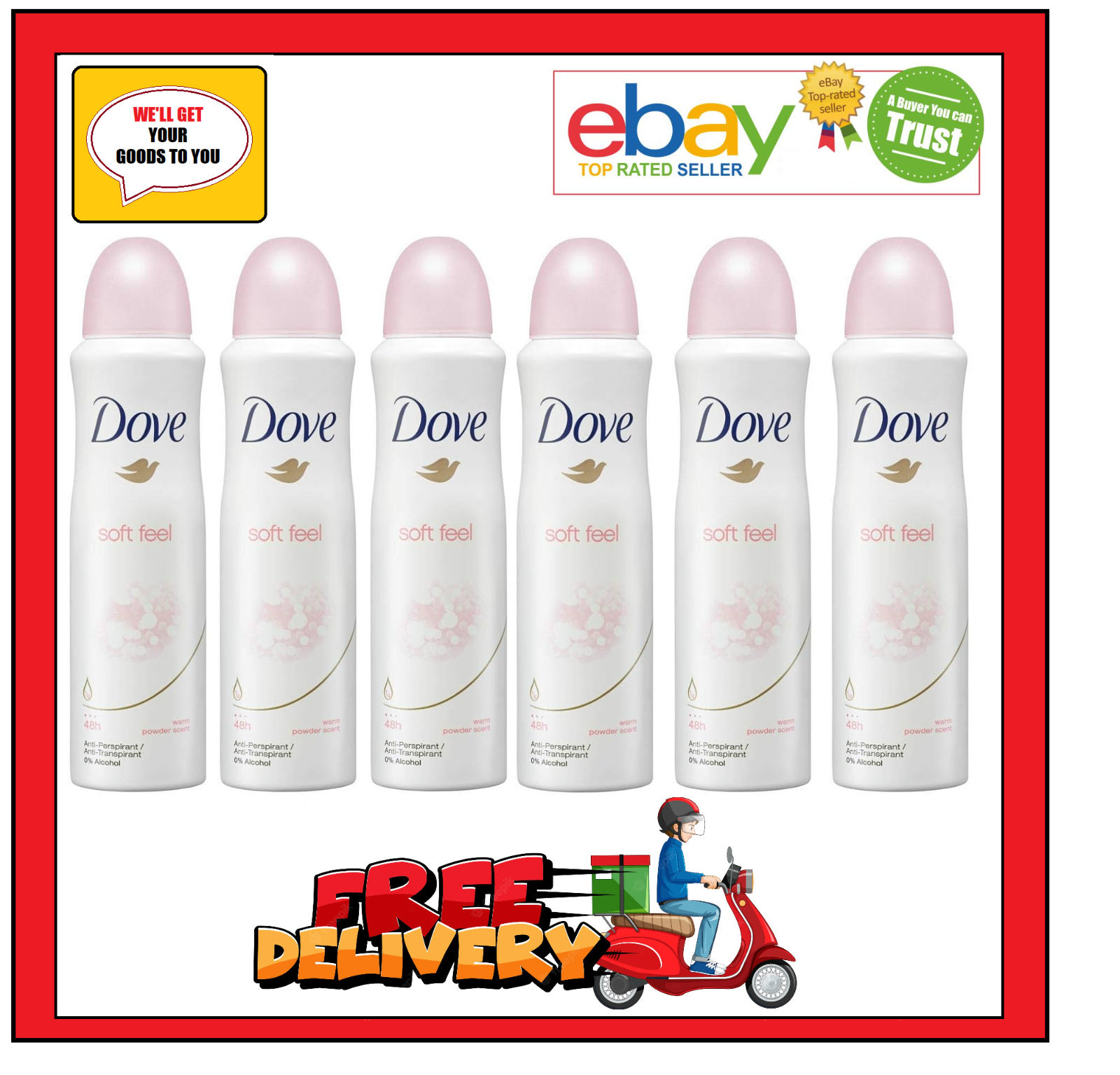 6 x 150ml Dove Soft Feel, 48h Warm Powder Scent Anti- Perspirant. 0% Alcohol