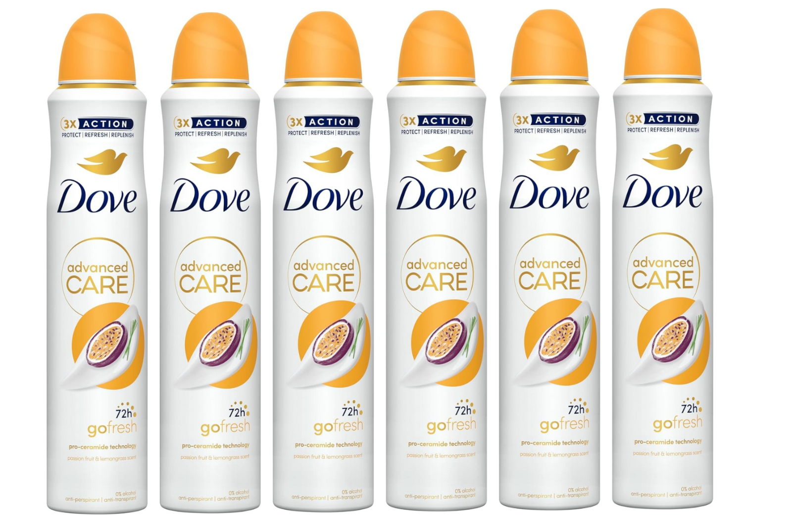6 x 250ml Dove Advanced Care Antiperspirant Deodorant Fruit & Lemongrass Scent
