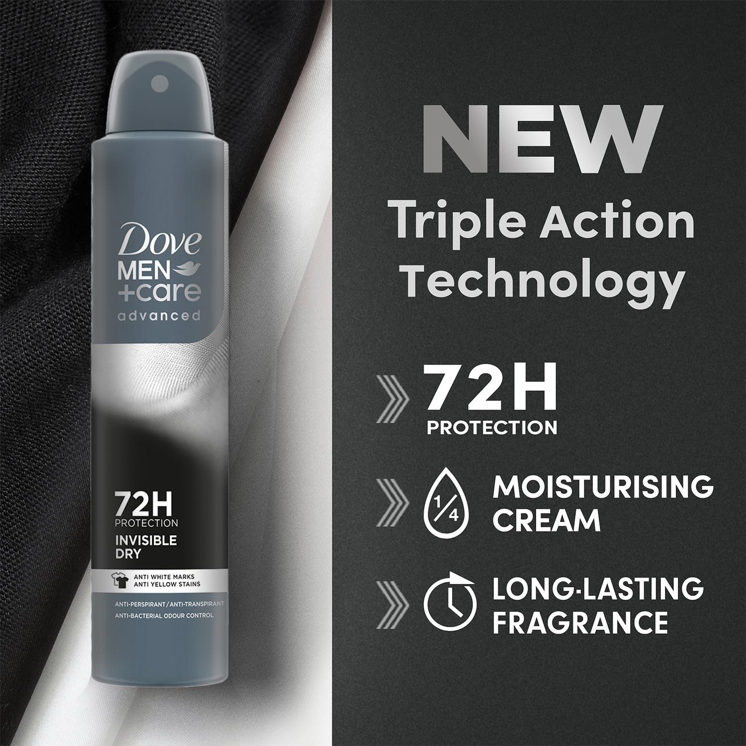 Dove Men+Care Advanced Invisible Dry Men's Antiperspirant Deodorant Body Spray with ¼ moisturising cream & Triple Action technology for 72 hour sweat and odour protection 200 ml