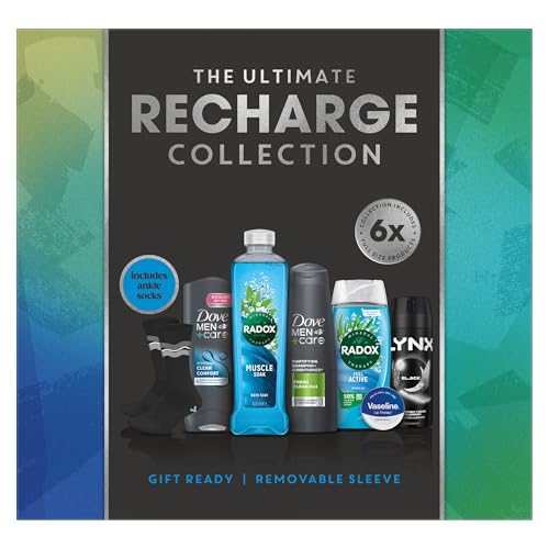 Dove Men+Care, Radox, Vaseline & Lynx The Ultimate Recharge Collection Gift Set body wash, shampoo, bath soak, shower gel, lip balm, body spray & socks perfect for any occasion 6 piece