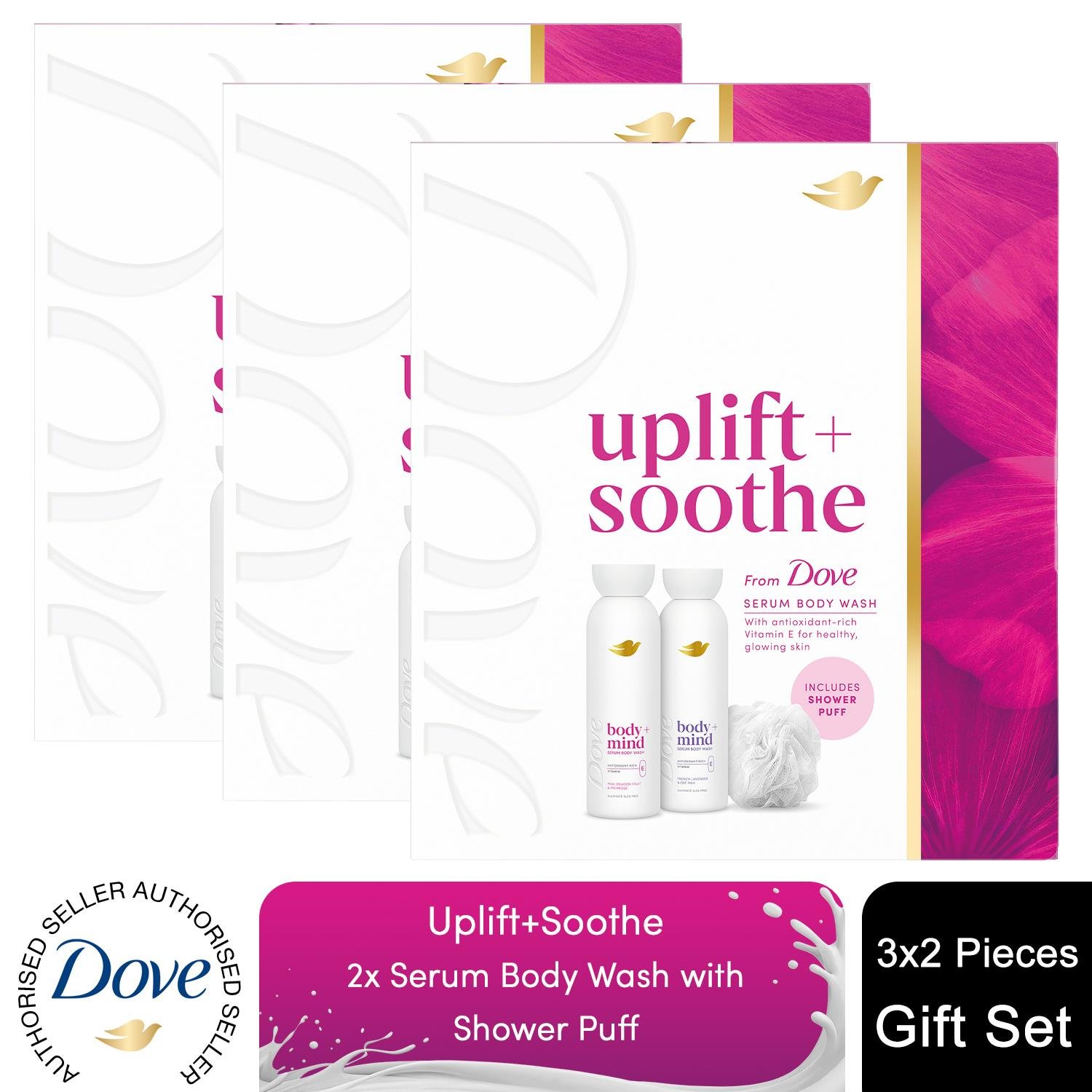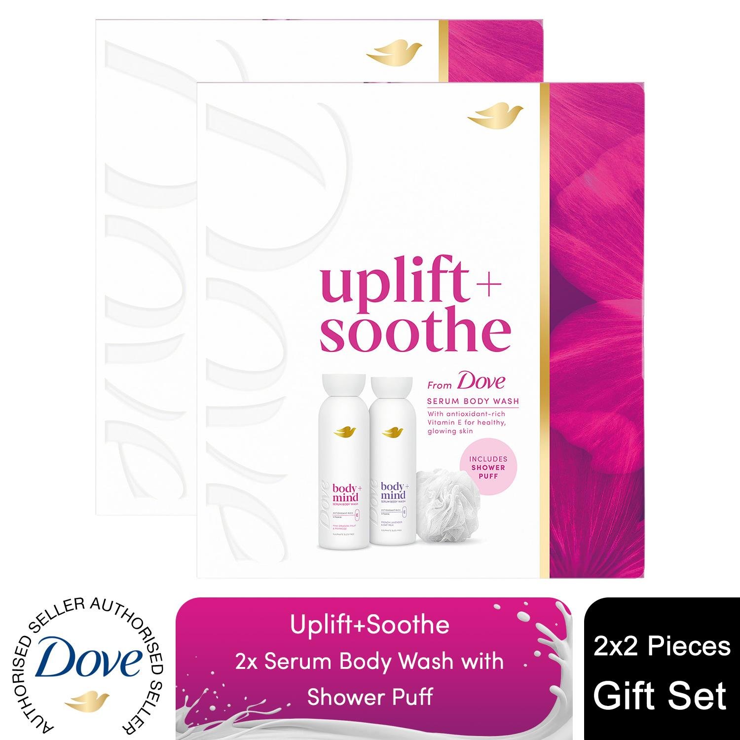 Dove Uplift + Soothe Collection Gift Set with two body washes and a Shower Puff perfect gifts for her 2 pc
