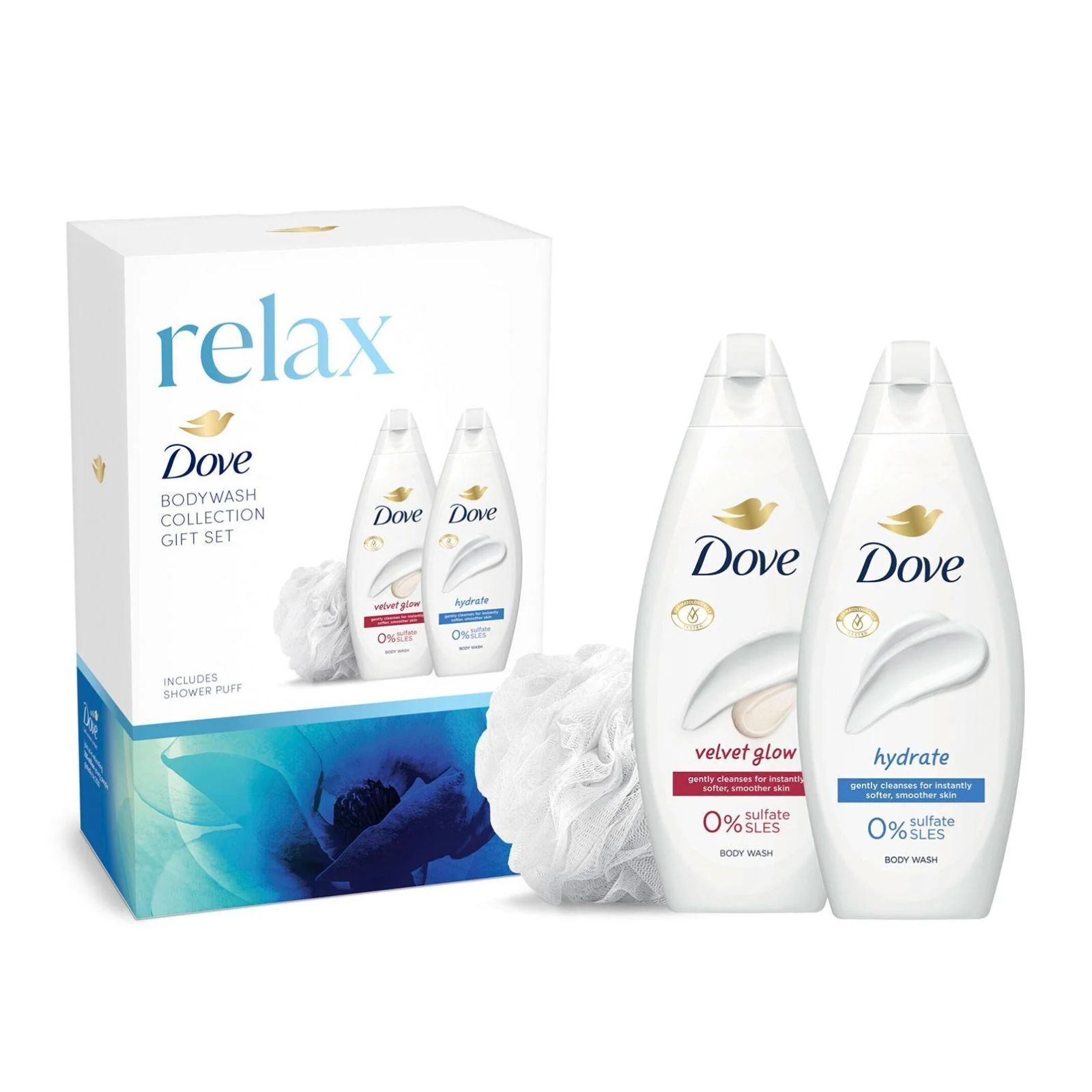 Dove Relax Duo Gift Set Body Wash Collection with a shower puff perfect gifts for her 2 piece