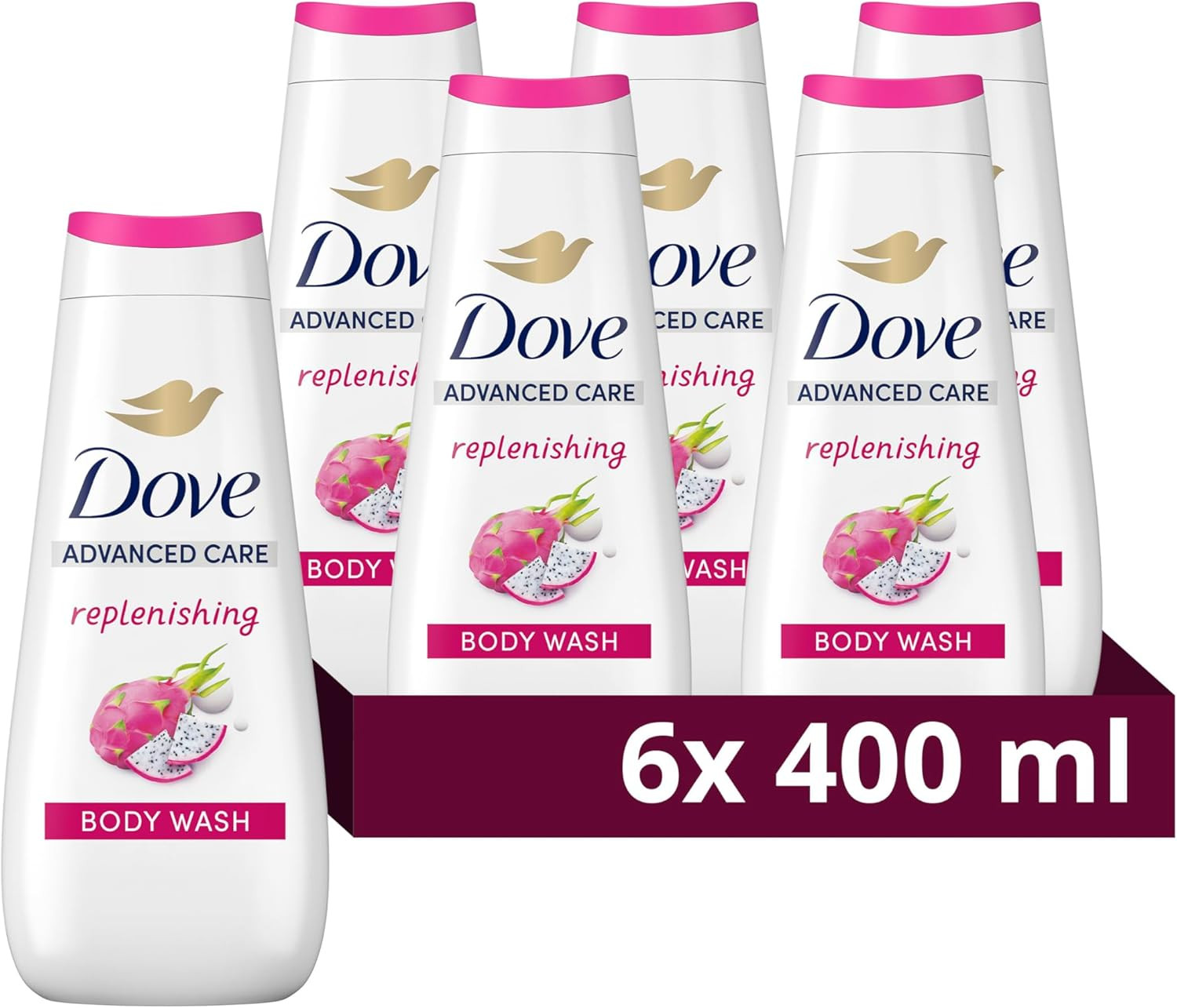 Dove Advanced Care Replenishing Body Wash shower gel with dragon fruit & coconut cream extracts for instantly lotion-soft skin 6x 400 ml