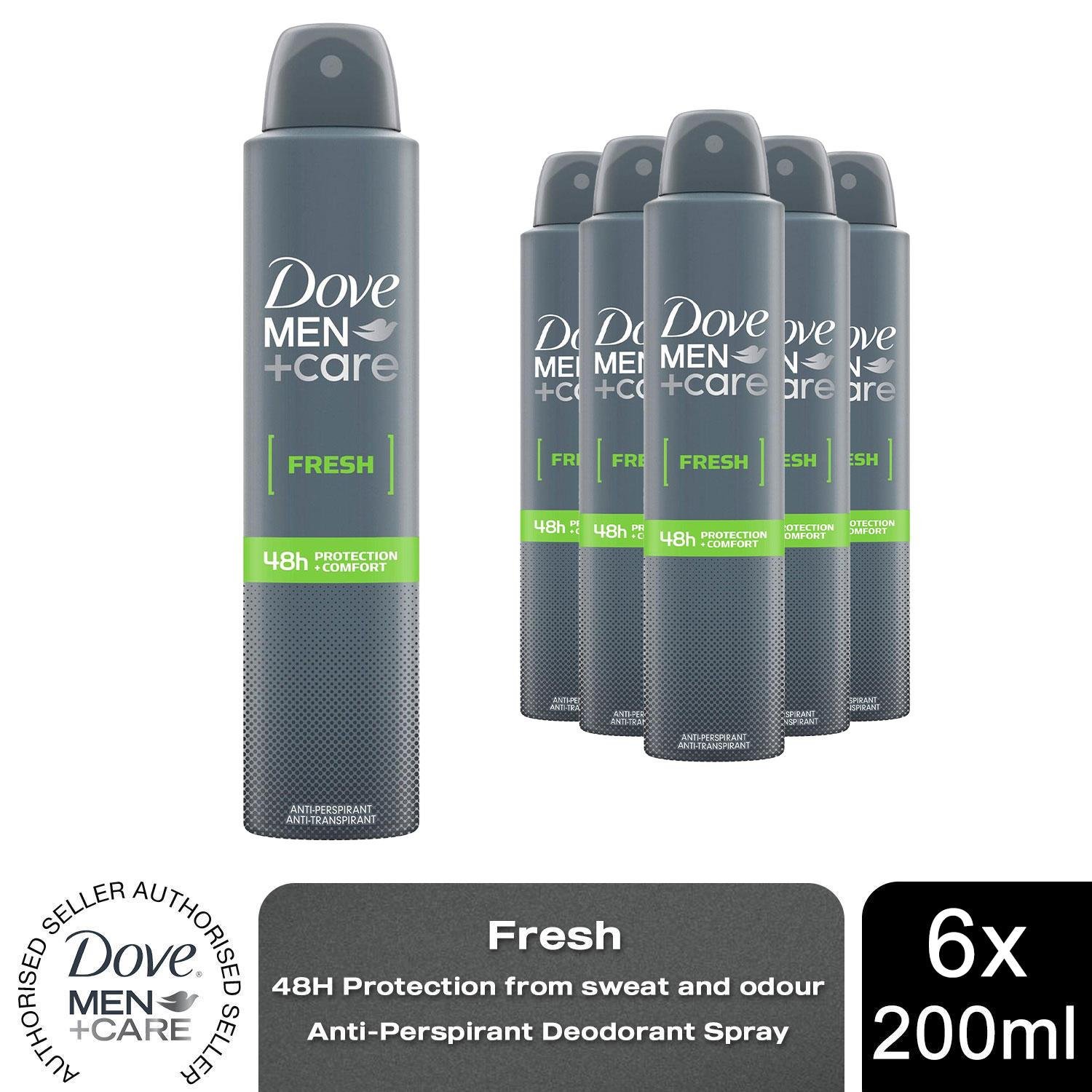 Dove Men+Care Fresh with ¼ moisturising cream Men's Antiperspirant Deodorant Body Spray for 48 hour sweat and odour protection 200 ml, Pack of 6, Packaging May Vary