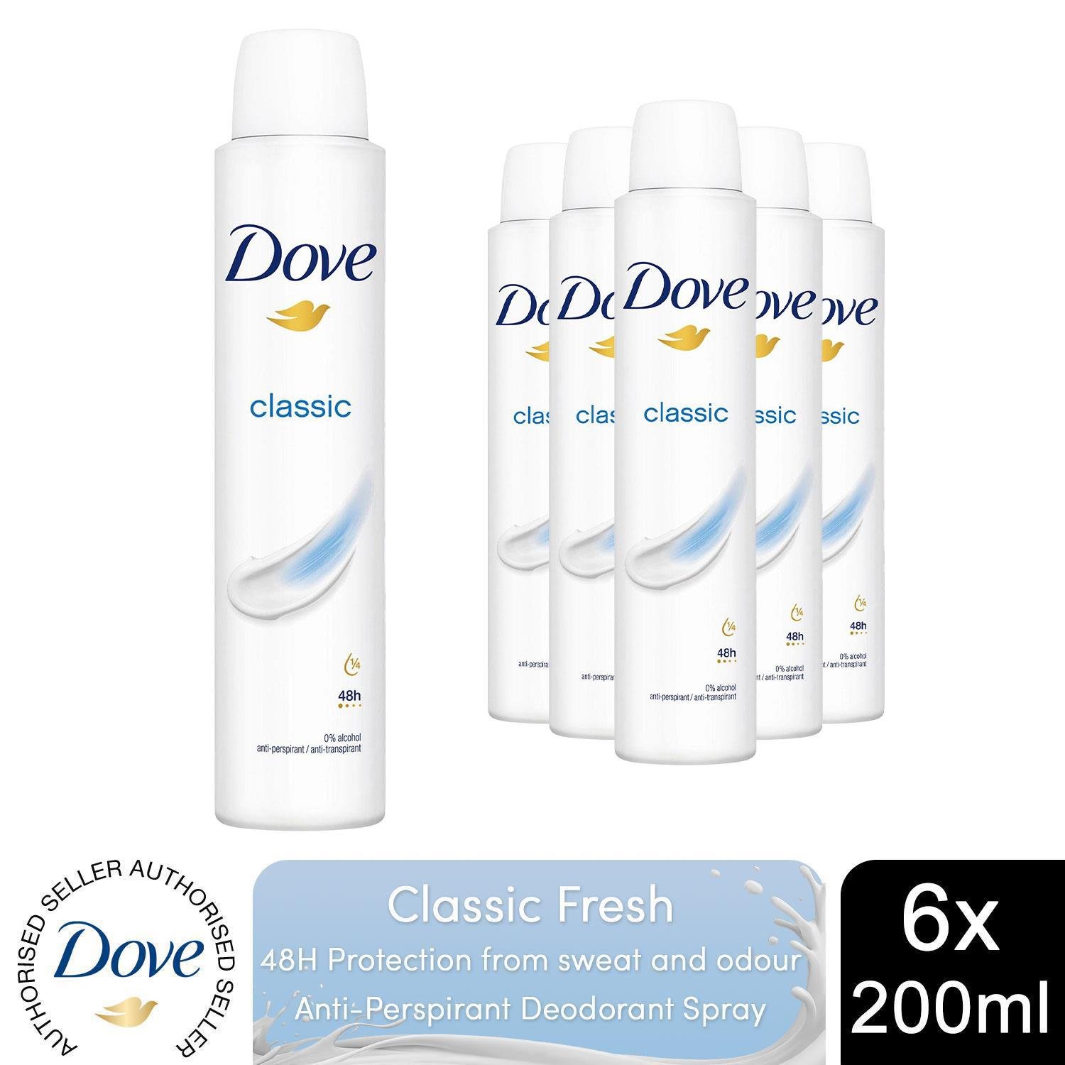 Dove Classic Fresh Women's Antiperspirant Deodorant Body Spray for 48 hour sweat and odour protection with ¼ moisturising cream 200 ml, Pack of 6