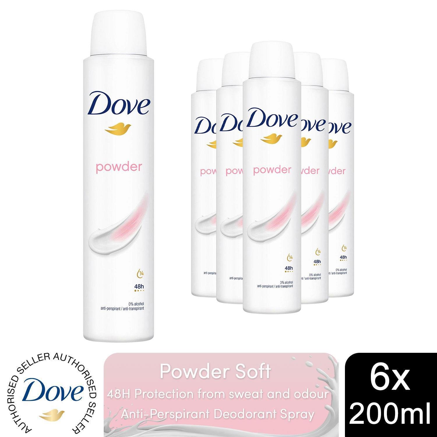Dove Powder Soft Women's Antiperspirant Deodorant Body Spray for 48 hour sweat and odour protection with ¼ moisturising cream 200 ml, Pack of 6