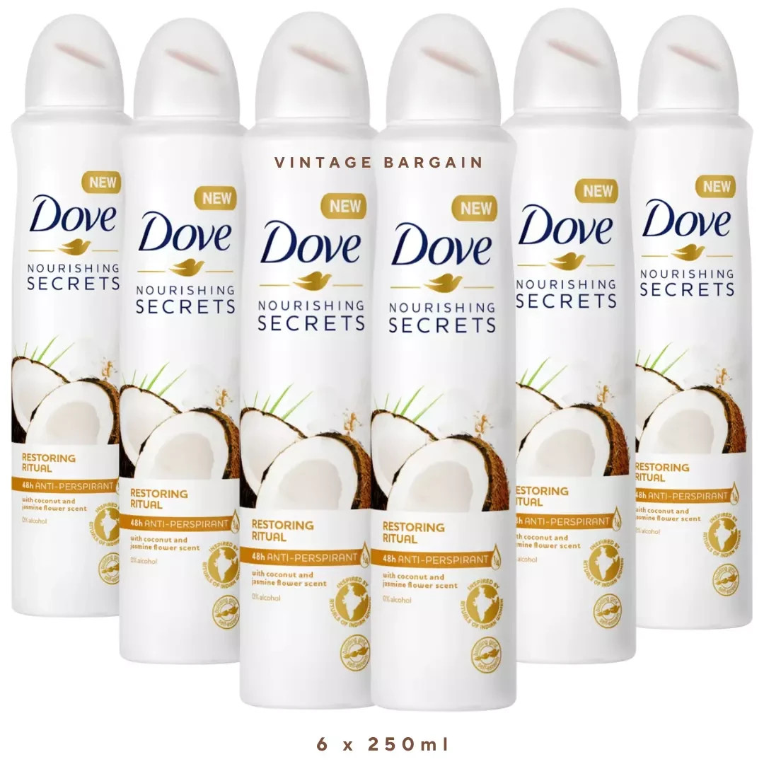 6 x 250ml Dove Restoring Ritual Deodorant Spray Coconut & Jasmin Scent
