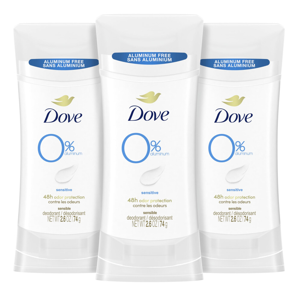 Dove 0% Aluminum Deodorant Stick Sensitive 3 Count Non-irritating Deodorant for Underarm Care Kindest Aluminum Free Deodorant 2.6 oz
