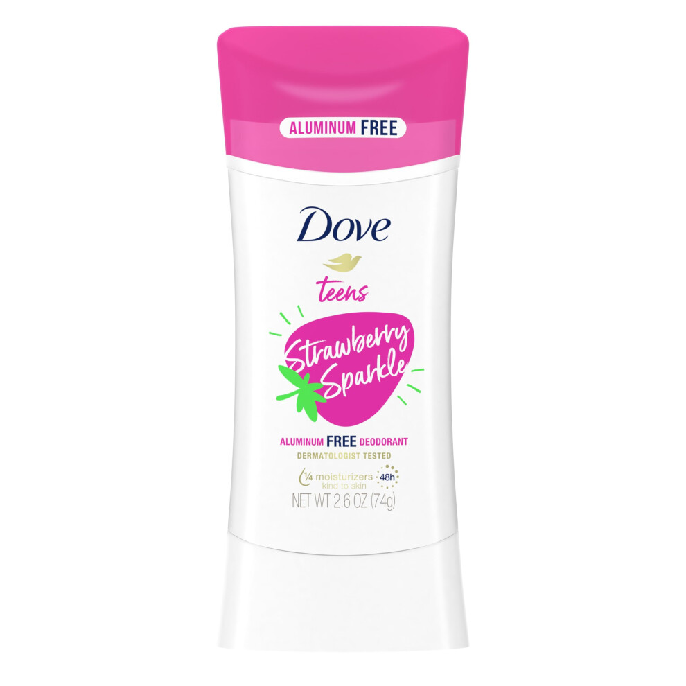 Dove Teens Deodorant Stick Strawberry Sparkle for gentle underarm care 48-hour odor protection and aluminum free deodorant 2.6 oz