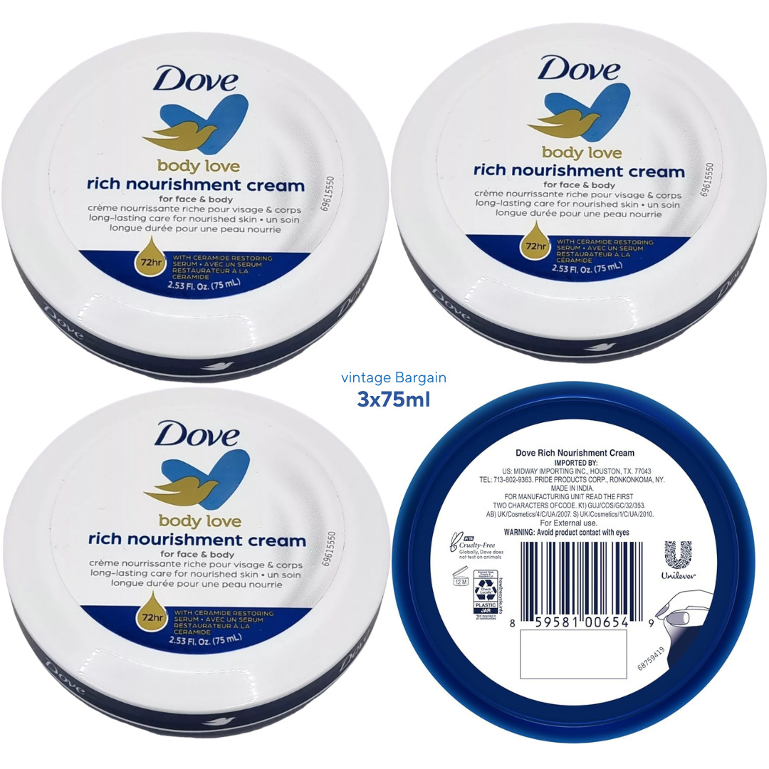 3 x DOVE BODY LOVE RICH NOURISHMENT CREAM FOR FACE & BODY 75ml each NEW/SEALED