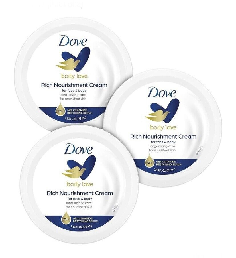 3 x Dove Rich Nourishing Body Love Cream 75ml Tub Face, Body 48H Moisture