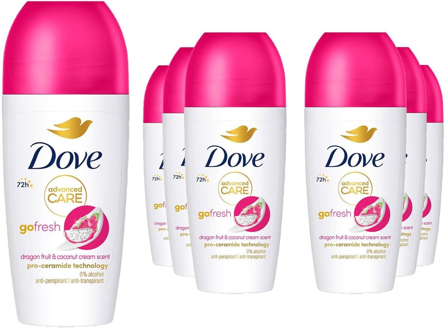 Dove Advanced Care Go Fresh Dragonfruit & Coconut Cream Scent Women's Antiperspirant Deodorant Roll On for 72 hour sweat protection with Pro-Ceramide technology 50 ml, Pack of 6