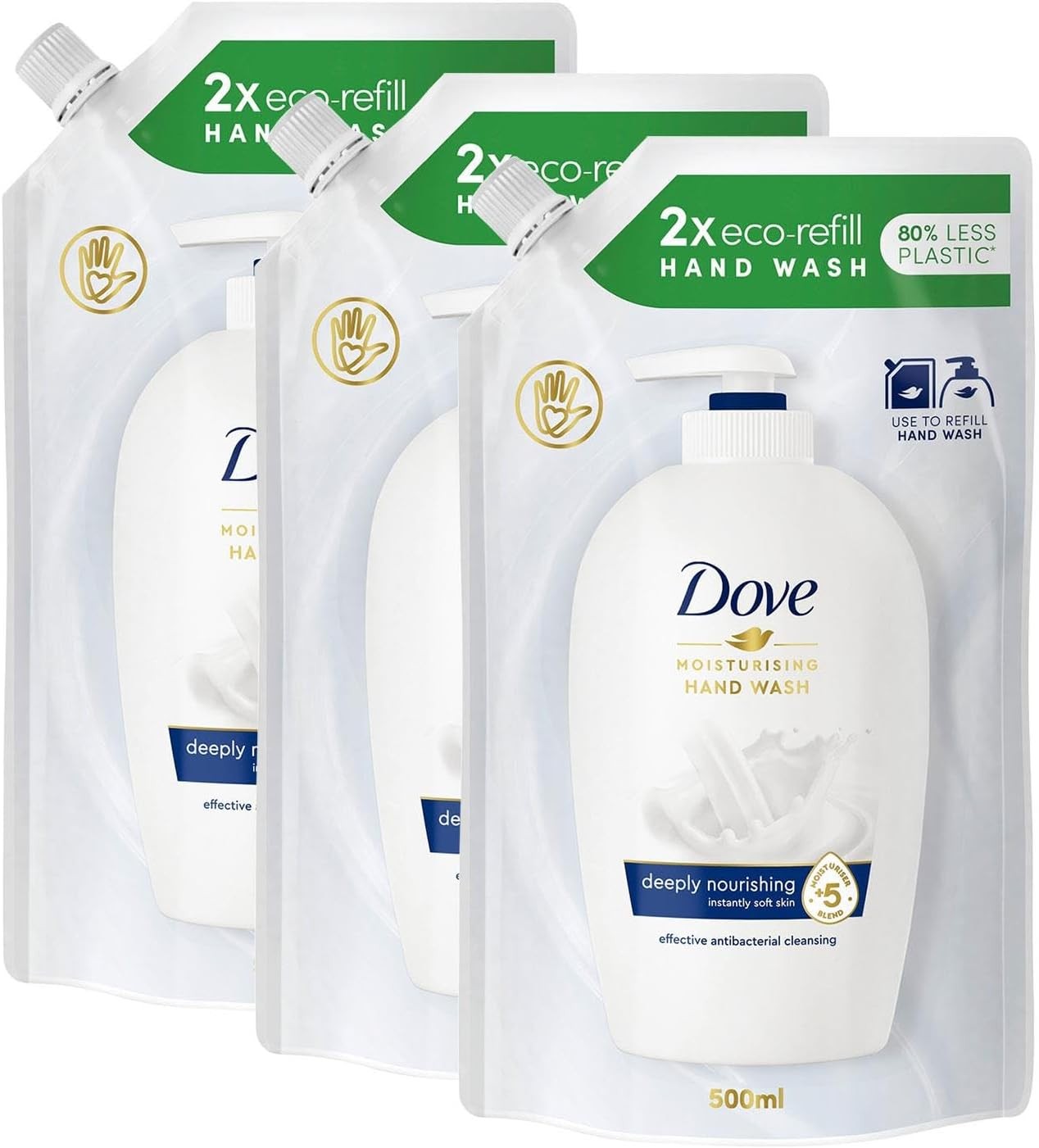 Dove Moisturising Eco-Refill for Liquid Hand Wash Effective Antibac Cleansing for 24H Nourishment and Instantly Soft Skin 500ml, 3 Pack