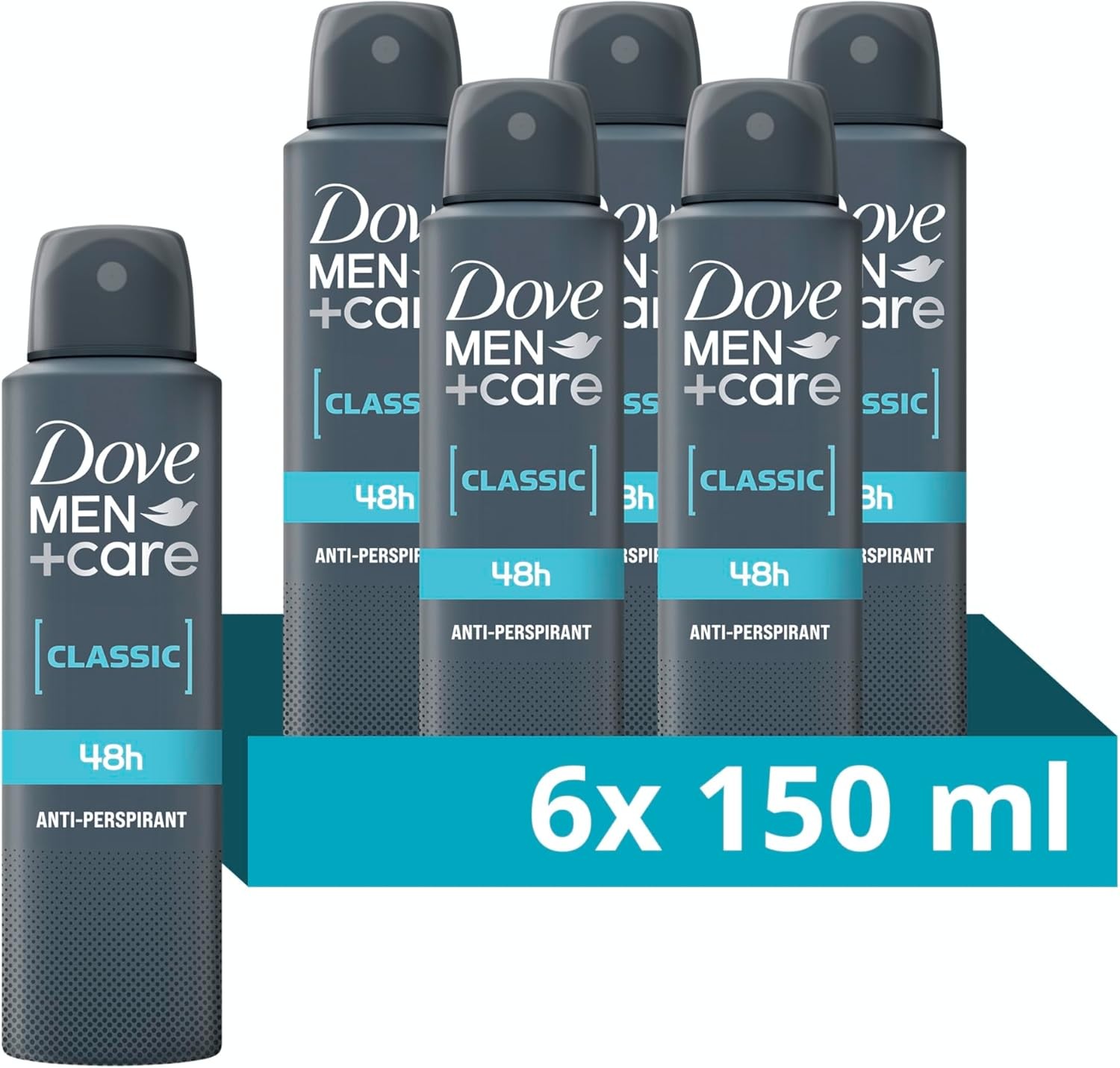 Dove Men+Care Classic with ¼ moisturising cream Men's Antiperspirant Deodorant Body Spray for 48 hour protection against sweat and odour 150 ml, Pack of 6