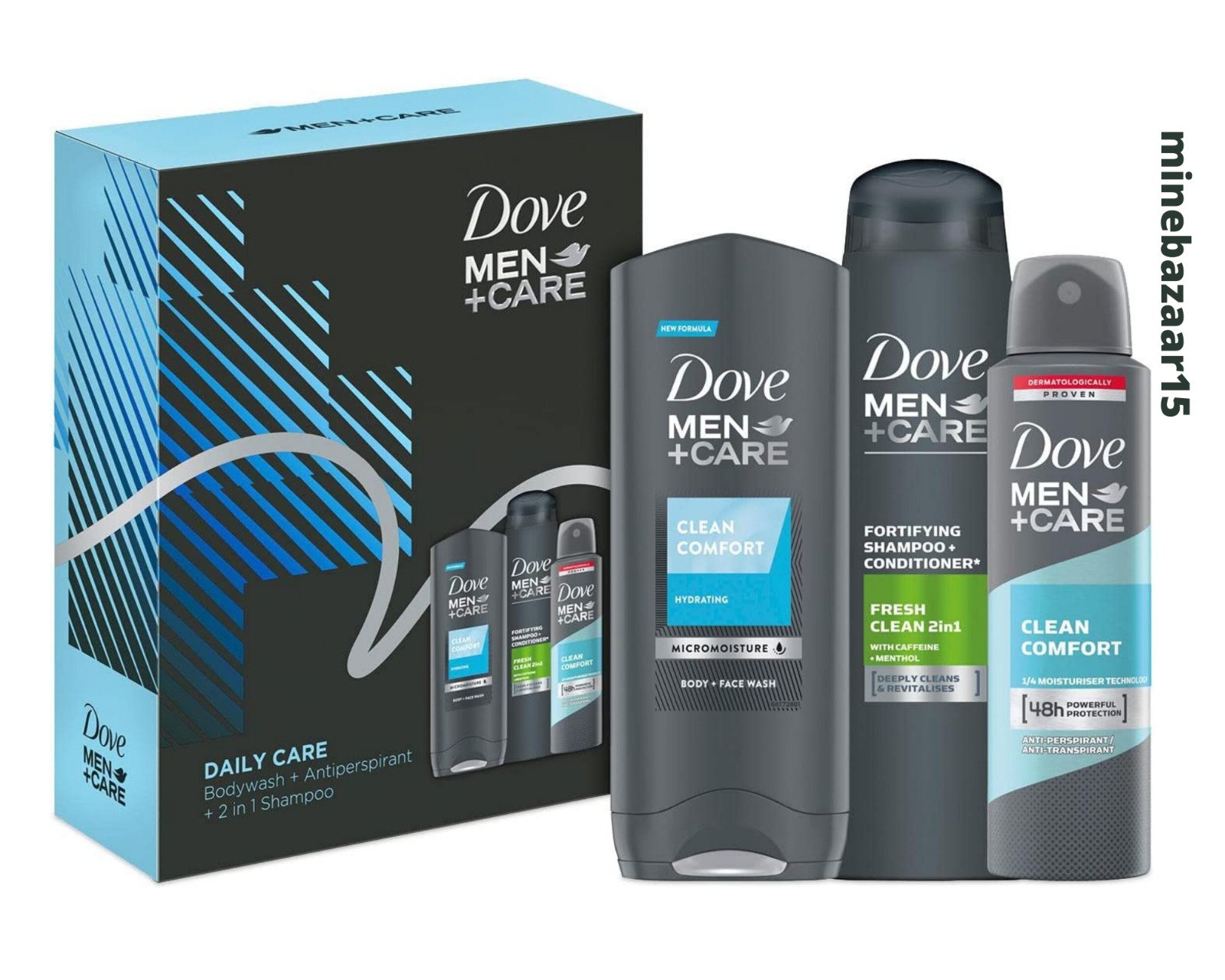 Dove Men+Care Gift Set Cleanse+Care Trio - Bodywash 250ml, Antiperspirant 150ml, 2-in-1 Fresh Clean Shampoo 250ml, 4 Pack - Grooming Essentials Kit