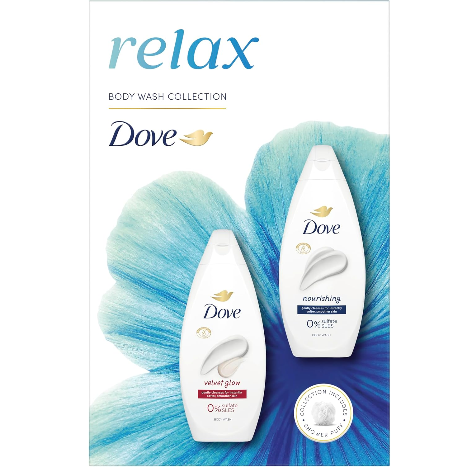 Dove Women RELAX Body Wash Gift Set (Velvet Glow & Nourishing 2x 225ml + Puff)