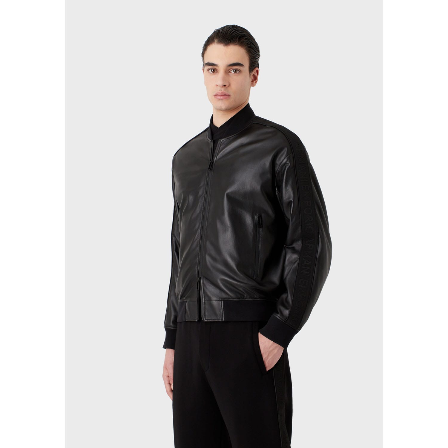 Emporio Armani Mens Leather Bomber Jacket in Black - Size X-Small