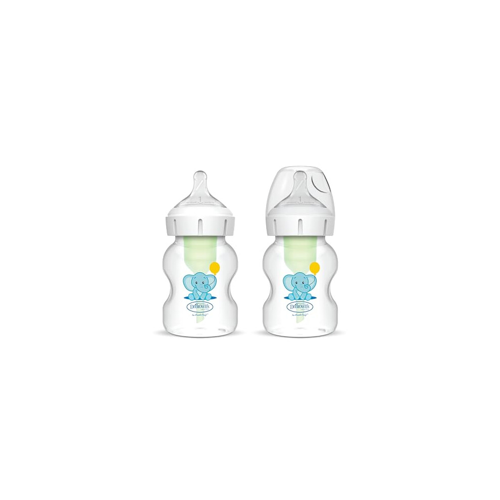 Dr Brown's Natural Flow? Anti-Colic Options+? Wide-Neck Baby Bottle, 5oz/150ml, with Level 1 Teats, 2-Pack, Elephant