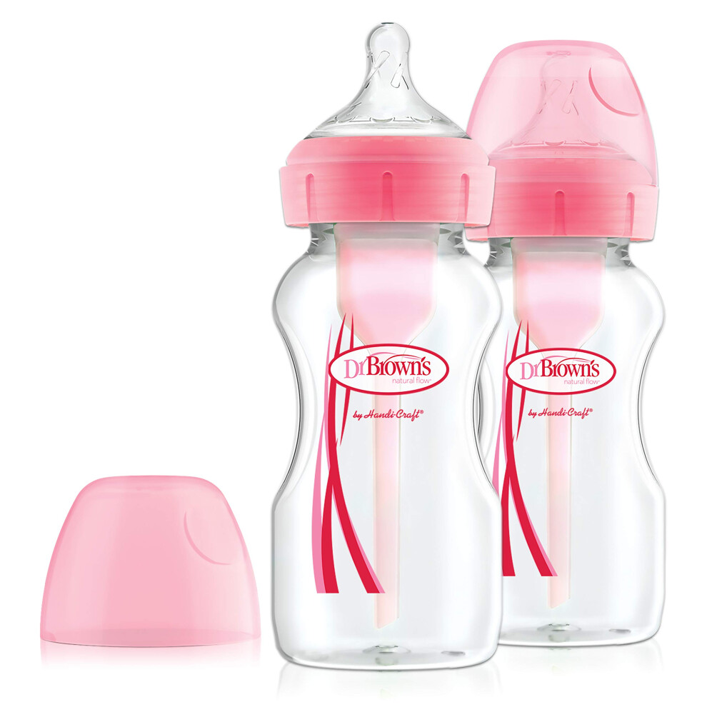 Dr Brown's Natural Flow Anti-Colic Options+ Wide-Neck Baby Bottle, 9oz/270ml, with Level 1 Teat, 2-Pack, Pink