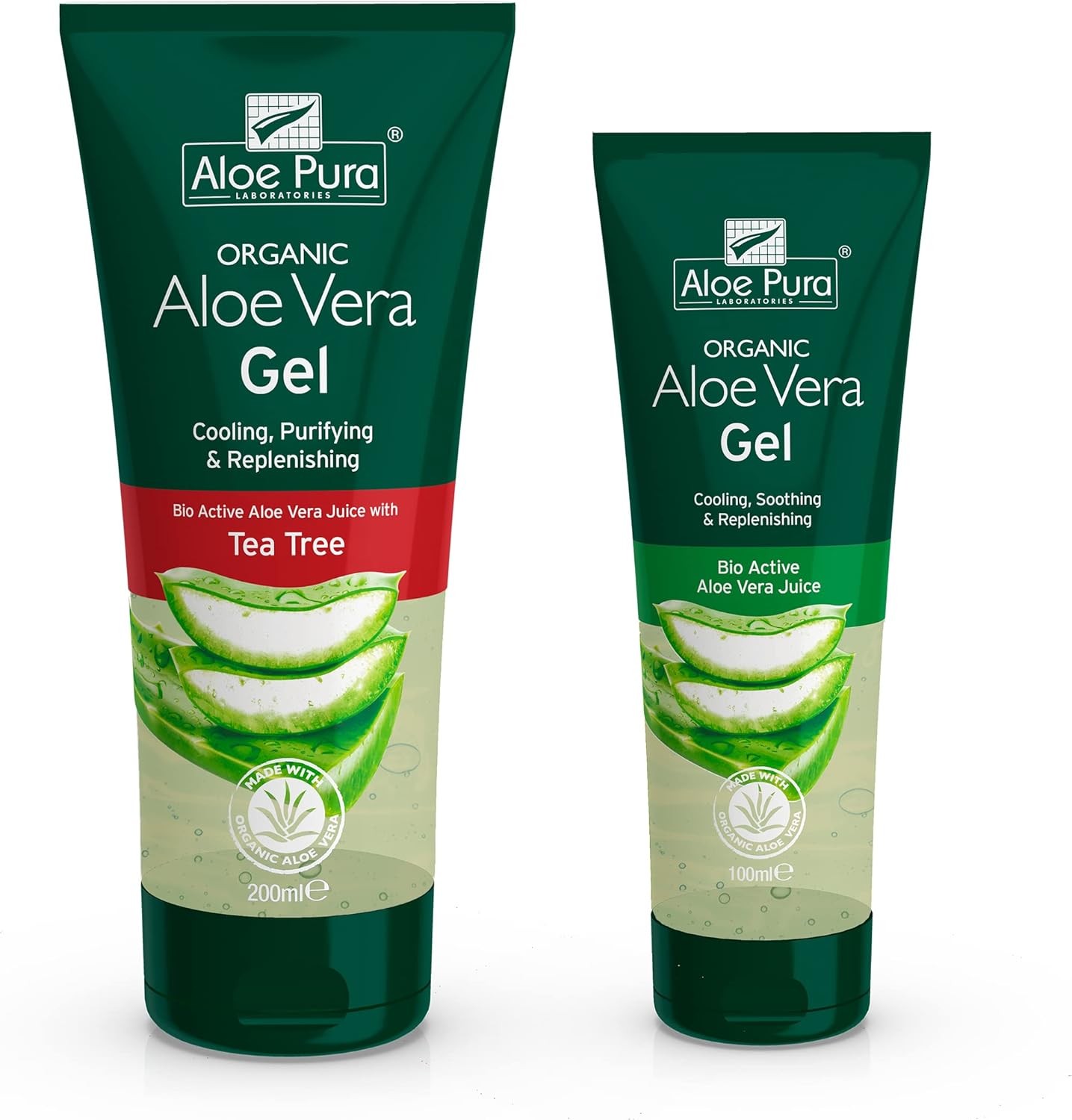 Aloe Pura Organic Aloe Vera Gel with Tea Tree 200ml & Aloe Vera Gel 100ml, Natu
