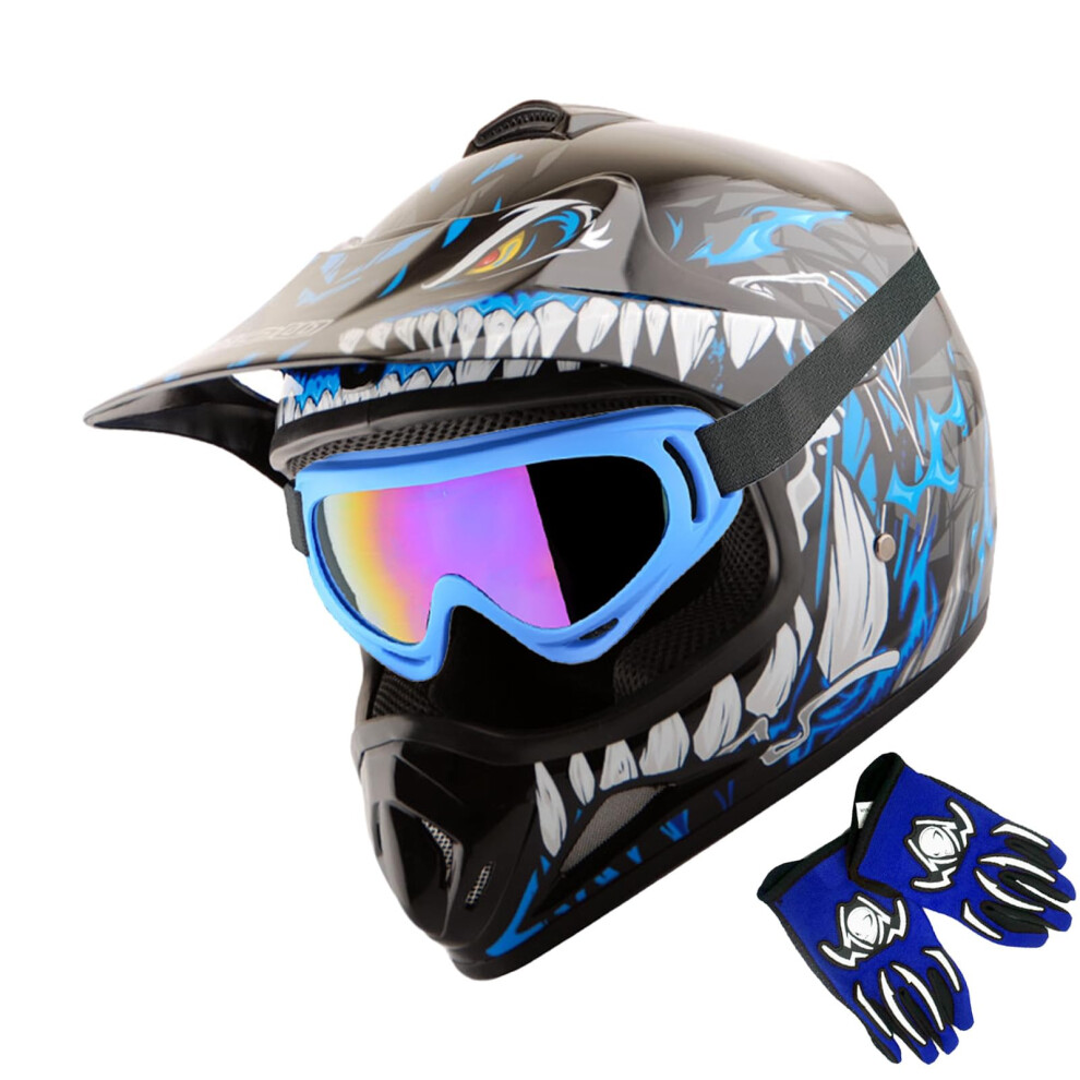 WOW Youth Kids Motocross BMX MX ATV Dirt Bike Helmet Dragon Blue Goggles MG Youth Blue Glove Bundle