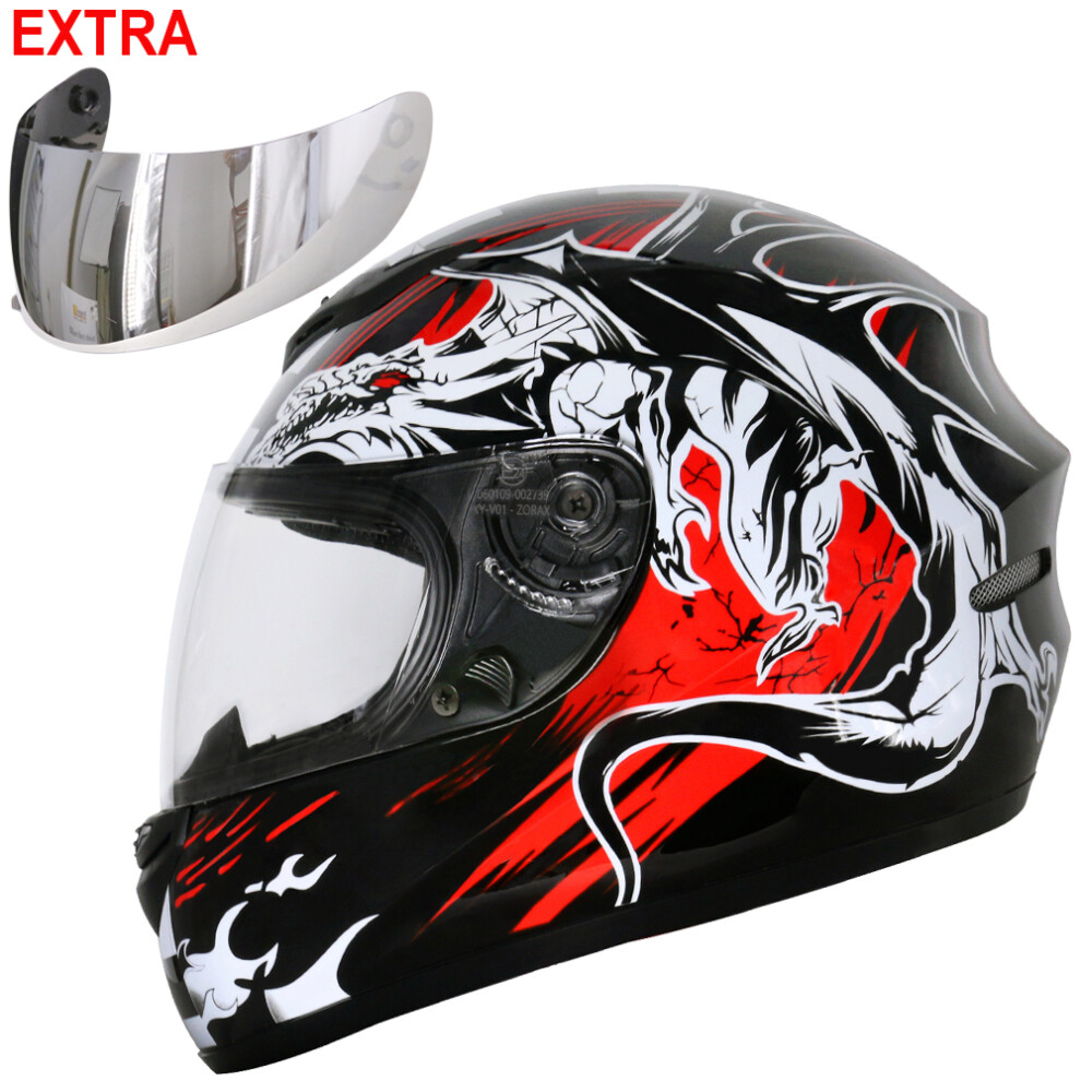 (Black Dragon + Mirror Visor, XS) ZORAX ZOR-819 Bike Full Face Motorcycle Helmet Motorbike Crash Helmet On Road + Optional Visor