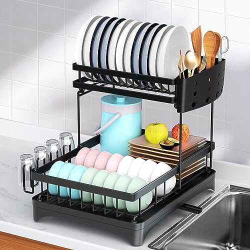 Zyerch Dish Racks 2 Level Countertop Drying Rack with Drain Tray, Kitchen Dish Strainers with Utensil Holder,Overhang Cutting Boards Large Capacity and Space Saving