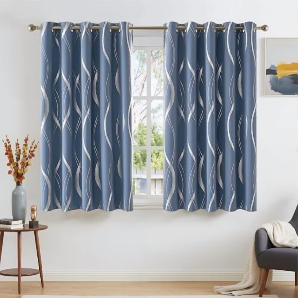 Stone Blue Blackout Floral Curtains 54 inch Length for Boys, Wave Line Foil Print Design Drapes for Kitchen and Nursery, W66 x L54, 2 Panels